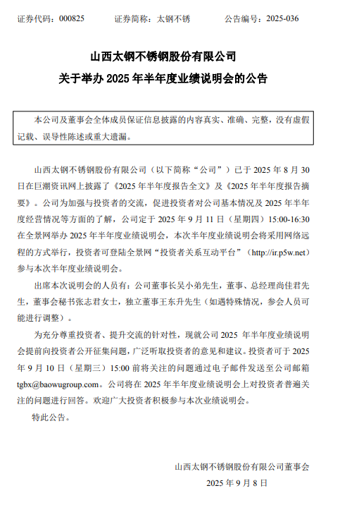 2025年9月8日,據《山西太鋼不銹鋼股份有限公司關于舉辦2025年半年度業績說明會的公告》顯示,公司定于2025年9月11日(星期四)15:00-16:30在全景網舉辦 2025年半年度業績說明會。